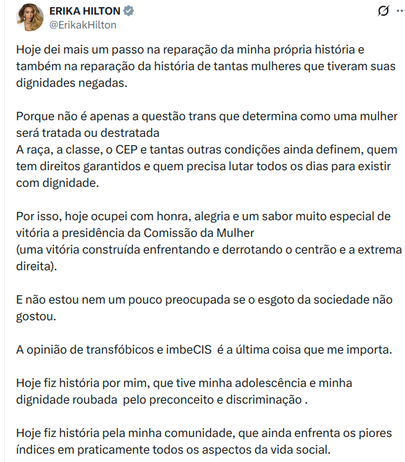Tendo em vista esses pontos, é muito provável que Erika Hílton esta mais preocupadas em privilegiar as pautas « trans », pauta ideológica, deixando em um segundo plano os verdadeiros problemas das mulheres biológicas.